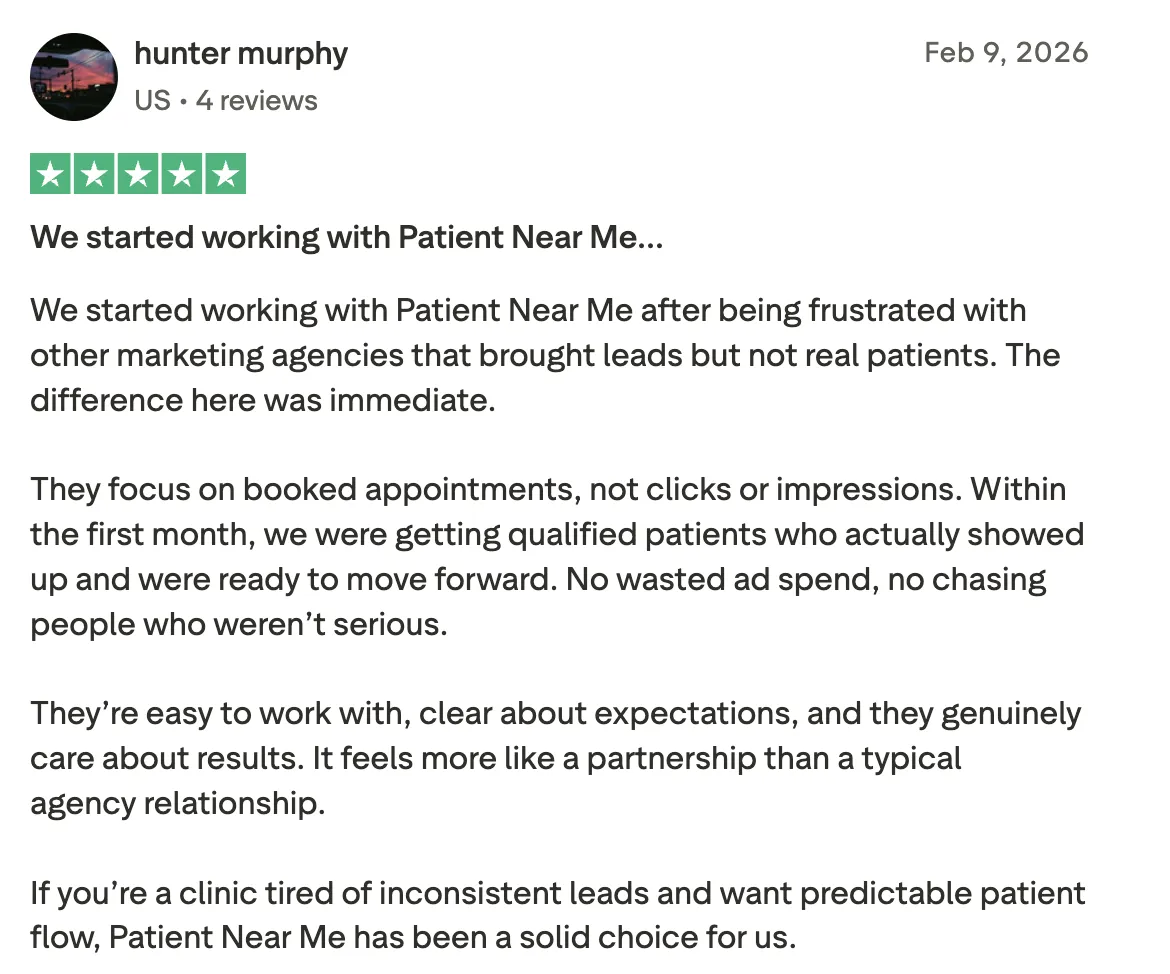 Agencies promise results "in 90 days" and ask you for thousands upfront. We don’t do that. We deliver real, ready to start patients who actually want treatment, and we back it with a no-results, no-pay guarantee. We do one thing only, and we're the best at it: Getting You More Patients.